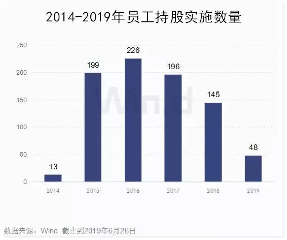 其中,2014年共实施13笔员工持股计划;2015年这个数字飙升至199笔;2016年,实施的员工持股计划增至226笔;从2017年开始,员工持股计划实施数量逐年减少,2017年为196笔,2018年145笔,截至到6月26日,今年共实施48笔员工持股计划,同比数量略有下滑。