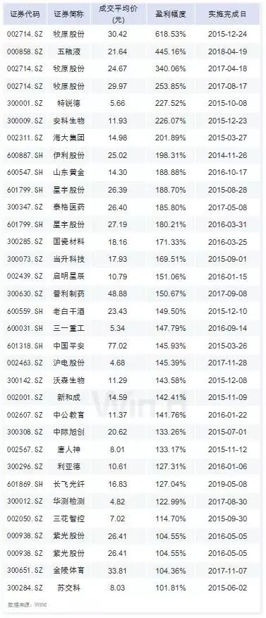 不过,依然有很多员工持股计划盈利,其中2014至今翻倍的有33笔,涉及29家公司。
