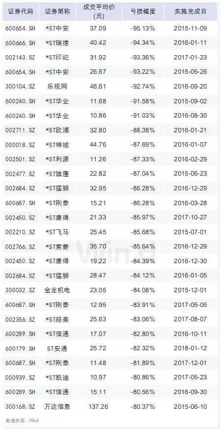 具体来看,其中162笔最新收盘价均跌破员工持股成本的50%以上,27笔浮亏超过8成,7笔浮亏超过9成,浮亏比例居前的均以ST公司为主。浮亏幅度最大的是*ST中安(1.790, -0.01, -0.56%)(维权),2015年11月9日和2015年5月26日实施的两笔至今已浮亏分别达95.13%和93.22%;此外,*ST瑞德(1.410, -0.02, -1.40%)(维权)浮亏94.34%,*ST印纪(1.320, 0.00, 0.00%)员工持股计划浮亏93.36%。